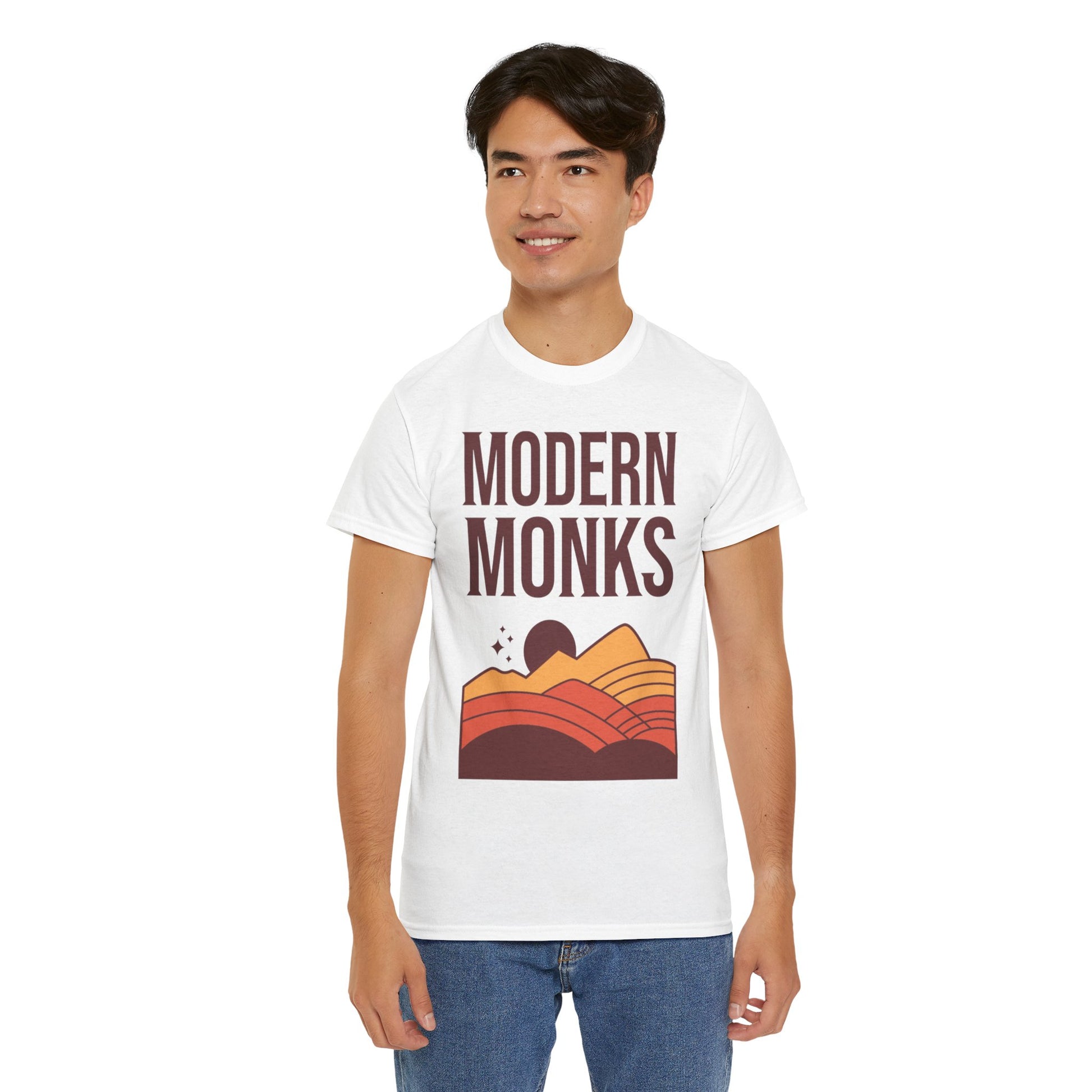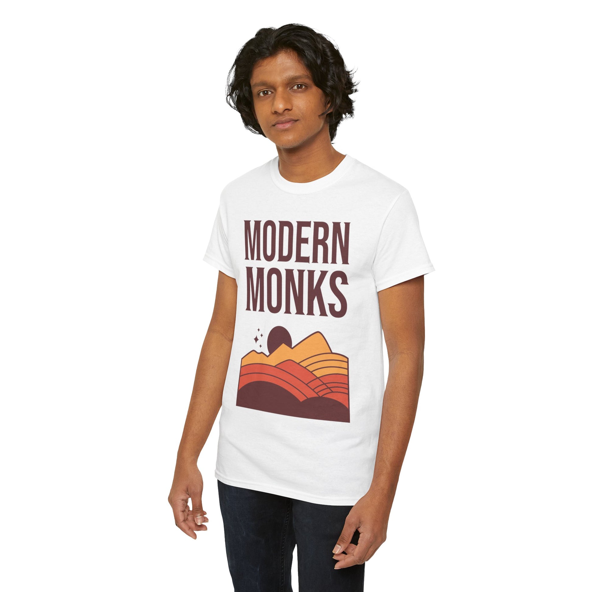 A comfortable and versatile T-Shirt featuring the band "Modern Monks" design of a sunrise over flowy hills in vibrant hues. Perfect for music lovers and those who appreciate nature-inspired artwork. Ideal for casual wear, concerts, festivals, or everyday outings.